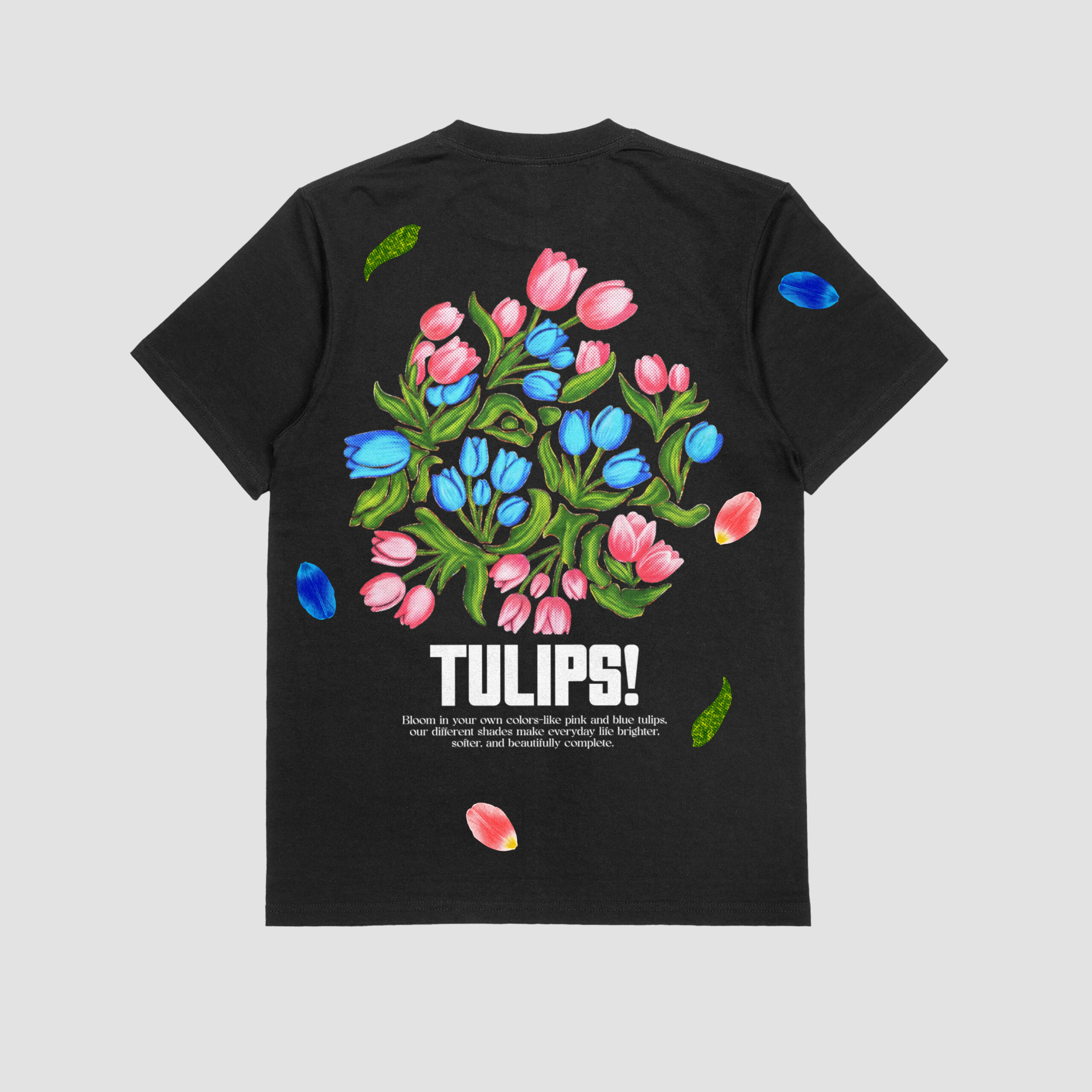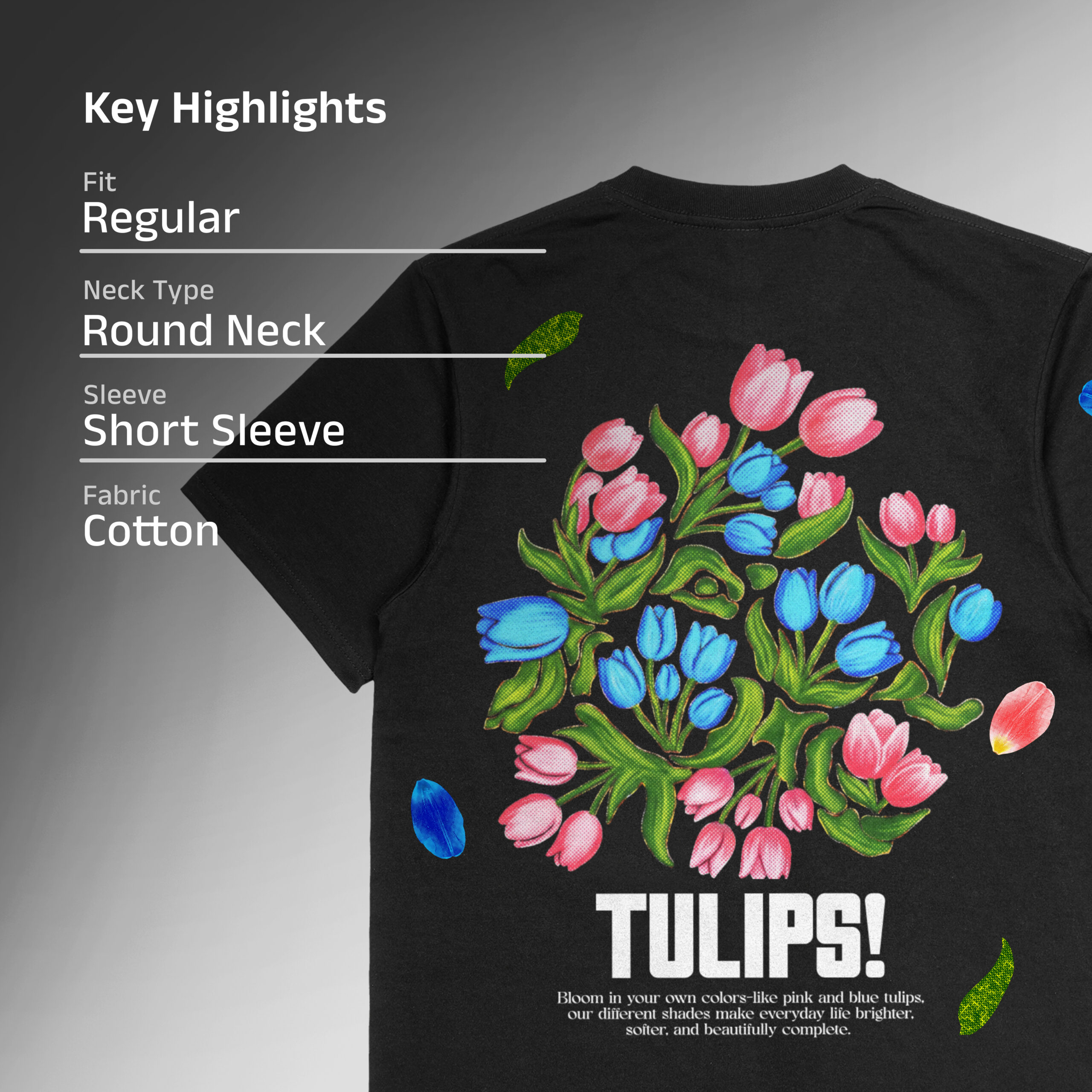 Vibrant Mixed Tulips T-Shirt in Malta showcasing a colorful floral design that adds energy to any outfit. This premium cotton graphic tee combines comfort with eye-catching botanical artwork, making it ideal for street style and everyday fashion.